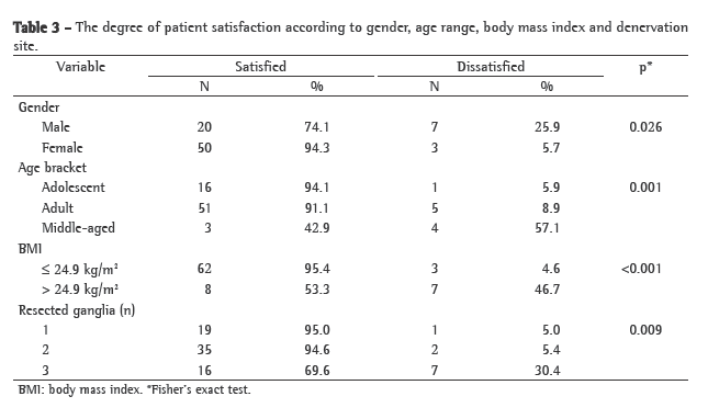 Many factors might play a role in the occurrence of compensatory sweating. In a study involving 134 patients,(15) the influence that age, gender, family history and combined plantar hyperhidrosis have on the occurrence and severity of post-operative compensatory sweating was studied using multivariate analysis. The authors found that age was the sole variable associated with a statistically significant increase in the occurrence of compensatory sweating but not with that of severe compensatory sweating. This is in agreement with the age-related differences observed in our study sample, in which the satisfied group consisted mainly of adults and adolescents (72.8 and 22.8%, respectively). However, our findings differed in other aspects, such as the influence of gender, the level of satisfaction being significantly higher among the females evaluated in our study (p = 0.026).