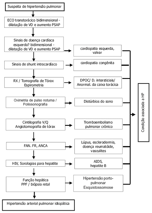 Como a avaliação complementar nestes doentes inclui vários exames, tem-se proposto um algoritmo de investigação diagnóstica nos pacientes com sus-peita de hipertensão pulmonar, de modo que se per-mita um diagnóstico precoce, e acurado, porém o menos dispendioso e invasivo possível (Figura 1).