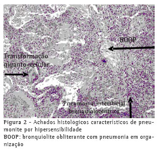 O encontro de pneumonia intersticial não específica, especialmente com bronquiolite obliterante e/ou predominância peribronquiolar, deve ser aceito como diagnóstico na presença de exposição relevante.(17) Em torno de 20% dos casos a pneumonia intersticial inespecífica é a forma de apresentação histológica. A importância dessa diferenciação histológica reside em sua resposta a agentes imunossupressores, à semelhança do que sucede com a forma idiopática (dados não publicados).