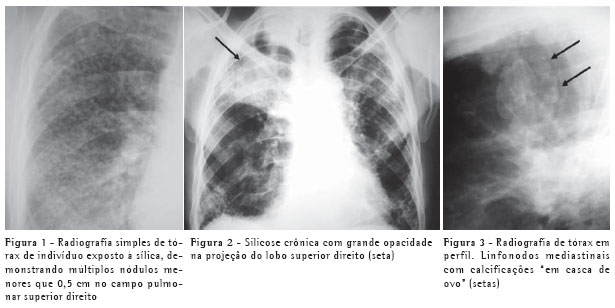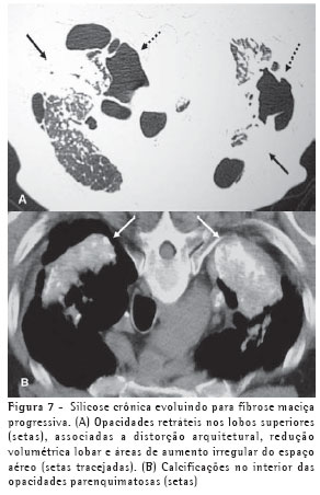 A TCAR é um método mais sensível e específico do que a radiografia simples para a detecção e caracterização da silicose. Permite melhor definição do tipo e da extensão das alterações, especialmente do enfisema centrolobular que pode estar presente nestes indivíduos e que é dificilmente demonstrado pela radiografia, a não ser nos casos mais acentuados. A concordância inter e intraobservador na avaliação das alterações respiratórias decorrentes da silicose é maior com a TCAR do que com a radiografia e a correlação com a função pulmonar é mais fidedigna com a TCAR. Em um estudo realizado num grupo exposto à sílica com radiografias normais, a TC estava alterada em 41% dos casos, sendo que em 10% as alterações eram visíveis apenas com a TCAR.(4) Nos indivíduos com radiografias alteradas, neste mesmo grupo, a TCAR permitiu melhor caracterização dos achados. Por estes motivos, segundo alguns autores, a TC deve ser realizada sistematicamente naqueles indivíduos expostos com suspeita de silicose na radiografia simples de tórax.