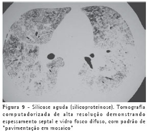 As duas outras formas de silicose são a acelerada, causada pela inalação de grandes quantidades de sílica, com evolução mais rápida que a crônica, e a silicose aguda, também conhecida como silicoproteinose, decorrente da inalação maciça de sílica por períodos muito curtos. Nesta forma da silicose, a radiografia e a TCAR (Figura 9) demonstram opacidades pulmonares difusas, por vezes associadas a espessamento de septos interlobulares e vidro fosco (padrão de "pavimentação em mosaico").(5)