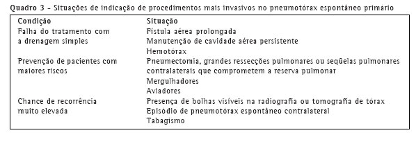 As indicações para procedimentos mais invasivos para o tratamento do primeiro episódio de pneumotórax espontâneo primário são descritas no Quadro 3.