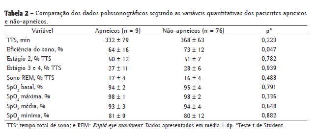 Utilizamos os critérios de Rechtschaffen & Kales para o estadiamento do sono: a eficiência do sono foi calculada como TTS dividido pelo tempo durante o qual o paciente permaneceu na cama. A latência do sono foi definida como o intervalo entre o desligar das luzes e o primeiro minuto no estagio 1 do sono. A latência para o sono rapid eye moviment (REM) foi definida como o intervalo entre o início do sono e o primeiro período do sono REM. Microdespertar foi definido como a mudança abrupta na frequência do eletroencefalograma com duração mínima de 3 s, precedido de no mínino 10 s de sono. O índice total de microdespertares correspondeu ao número de microdespertares dividido pelo número total de horas de sono.