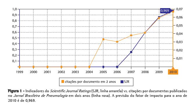 Utilizando a mesma metodologia que a Thomson Reuters, o SCImago estima que o fator de impacto atual do JBP é de 0,97 (Figura 1). A diferença entre os dois índices reside em um número maior de periódicos constantes da base de dados SciVerse Scopus, utilizada pelo SCImago, possuindo uma forte e significativa correlação.(2)