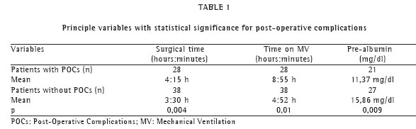 The objective of this study was to assess nutritional indices such as pre-albumin levels and lymphocyte counts, as well as surgical time and time on MV, in order to characterize the influence of these factors on post-operative morbidity.