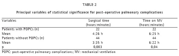 The highest rate of respiratory complications was associated with longer surgical times. According to some authors,(16) the most common post-operative complication following operations lasting over four hours is pneumonia, regardless of which lung is affected.