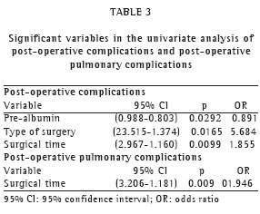 Various studies have demonstrated a relationship between POCs and low lymphocyte counts. In order to complement the assessment of patients with suspected protein-calorie malnutrition, one must determine serum proteins such as pre-albumin, further to assessing the number of lymphocytes.(21) In the present study, lymphocyte count was not sufficiently sensitive to predict POCs, a finding that contradicts those of the articles cited. However, pre-albumin level proved to be a nutritional index that is predictive of POCs, although not specifically predictive of POPCs.