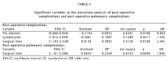 In order to describe the sample profile according to the many variables under study, descriptive statistical tables of the continuous variables were prepared, as were tables describing the frequency of the categorical variables. For the purposes of comparing POCs and POPCs in terms of categorical variables, the chi-square test or, when necessary, Fisher's exact test, was used. To compare POCs and POPCs in terms of continuous variables, the Mann-Whitney non-parametric test, which compares the observation posts, was used. In order to determine which factors influenced pulmonary complications, logistic regression was used via univariate analysis, together with stepwise multivariate analysis.(12-13) A significance level of 5% (i.e., p < 0.05) was adopted.