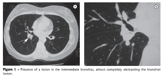 A 39-year-old female patient presented with a history of recurrent pneumonia, together with sporadic episodes of productive cough and fever. In the two preceding years, the patient had had four episodes of moderate volume hemoptysis. In the preoperative investigation, a CT scan of the chest revealed a lesion in the intermediate bronchus (Figure 1), as well as cystic bronchiectasis in the right lower lobe (Figure 2). Fiberoptic bronchoscopy confirmed the tomographic finding of a wine-colored, exophytic endobronchial lesion at the root of the intermediate bronchus, and biopsy of the lesion revealed a typical carcinoid tumor.