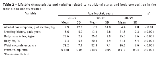 The mean smoking history was lower among younger respondents than among those older than 30 years of age (p < 0.001), as were the mean anthropometric indicators of body fat distribution (p < 0.001). Alcohol consumption (g of alcohol/day) was higher among younger respondents (p = 0.01) than among those older than 30 years of age (Table 2).