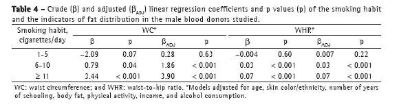 The influence of tobacco use on abdominal fat is still unclear. In the present study, the multivariate linear regression analysis confirmed the association between anthropometric indicators of abdominal adiposity (WC and WHR) and smoking after the adjustment for a few factors, including alcohol consumption. The study results showed a dose-response effect on these associations for both WC and WHR. When compared with nonsmokers, smokers of 6-10 cigarettes/day had a 2-cm increase in WC, whereas smokers of ≥ 11 cigarettes/day had a 4-cm increase. Some studies have failed to show this association.(10,21)