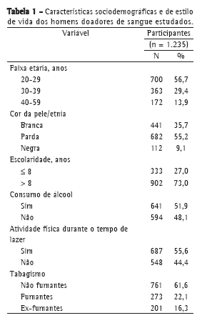 MétodosO presente estudo baseou-se em uma análise prévia de um estudo transversal com doadores de sangue conduzido entre agosto de 1999 e janeiro de 2000. A amostra do estudo consistiu em 1.235 homens adultos doadores de sangue, de 20 a 59 anos de idade, recrutados junto ao Hemocentro de Cuiabá, em Cuiabá (MT). Os detalhes a respeito do processo de amostragem para o estudo em questão já foram publicados.(13)