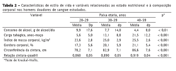 A carga tabágica média foi menor nos entrevistados mais jovens do que naqueles com mais de 30 anos de idade (p < 0,001), assim como a média dos indicadores antropométricos de distribuição de gordura corporal (p < 0,001). O consumo de álcool (g de álcool/dia) foi maior entre os entrevistados mais jovens (p = 0,01) do que naqueles com mais de 30 anos de idade (Tabela 2).