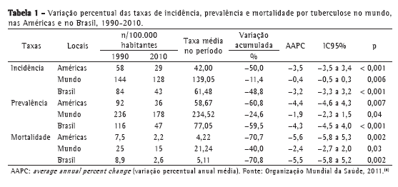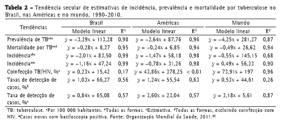 A Tabela 2 descreve a tendência secular de estimativas de incidência, prevalência e mortalidade por tuberculose no Brasil, Américas e mundo, no período entre 1990 e 2010. Em relação à prevalência geral da tuberculose, a maior queda observada foi em âmbito global, seguida por aquela no Brasil e Américas; a estimativa de mortalidade por tuberculose (de todas as formas, excluindo a coinfecção tuberculose/HIV) por 100.000 habitantes diminuiu mais no mundo, seguida por aquela no Brasil e nas Américas; a estimativa de incidência (de todas as formas) por 100.000 habitantes obteve maior queda no Brasil e nas Américas, enquanto houve um crescimento sutil no mundo; a estimativa de incidência (casos novos com baciloscopia positiva) por 100.000 habitantes diminuiu no Brasil e nas Américas, enquanto essa cresceu no mundo; a estimativa de coinfecção de tuberculose/HIV aumentou mais no mundo, seguida por Américas e Brasil; nas Américas, a taxa de detecção de casos (todas as formas) em porcentagem aumentou mais, seguida daquela no Brasil e no mundo; finalmente, a taxa de detecção de casos novos (com baciloscopia positiva) em porcentagem aumentou proporcionalmente mais nas Américas, no mundo e no Brasil.