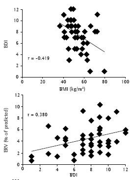 Table 1 also shows the mean arterial blood gas analysis values for the individuals studied. The mean P(A-a)O2 for the sample as a whole (22.5 ± 8.6 mmHg) was slightly higher than the expected value of 17.28 mmHg. Thirty-six individuals presented P(A-a)O2 values below the predicted value (73.5%). The mean PaO2 of the patients in the sample as a whole (75.9 ± 9.6 mmHg) was very close to the 77.64 ± 8.99 mmHg expected for their age. Nevertheless, 29 patients presented PaO2 values lower than that calculated (59.2%). Only 2 patients presented PaCO2 values greater than 45 mmHg, and the sample as a whole presented normocapnia. When comparing Group 1 and Group 2 in terms of the gas exchange data, we notice that the pH was significantly lower in Group 1 than in Group 2 (7.43 ± 0.03 vs. 7.48 ± 0.10). We also evaluated the correlation between BDI and BMI, as well as how BDI and BMI correlated with each of the spirometric and gasometric variables measured. The correlations that presented statistical significance are listed in Table 2 and Figure 1. We found that BMI correlated positively with the RV/TLC ratio, PaCO2 and P(A-a)O2, whereas it correlated inversely with the FEV1/FVC ratio, FEF25-75% and PaO2. The BDI correlated inversely with the BMI, P(A-a)O2, PaCO2 and the RV/TLC ratio. The BDI correlated directly with ERV and PaO2.