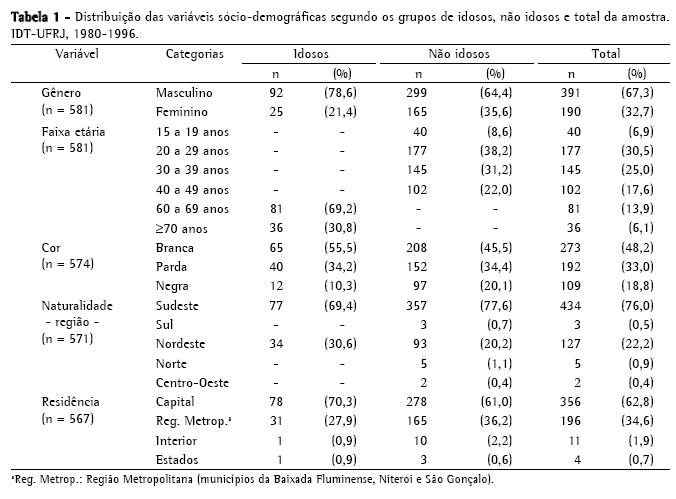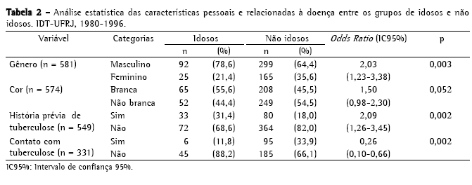 Foram incluídos neste estudo pacientes com TP que atenderam aos seguintes requisitos: diagnóstico de certeza ou probabilidade de TP, segundo as normas do Ministério da Saúde(17) (foram considerados, também, os achados histopatológicos compatíveis com TP, como processo inflamatório crônico granulomatoso com necrose de caseificação e infiltrado histiocitário de células multinucleadas); acompanhamento clínico exclusivo do IDT-UFRJ; e utilização do esquema I (dois meses de rifampicina + isoniazida + pirazinamida seguidos por quatro meses de rifampicina + isoniazida).(17-19) Foram definidos os seguintes critérios de exclusão de pacientes, para assegurar a homogeneidade da amostra estudada: mudança de diagnóstico; suspeita inicial de micobacteriose não tuberculosa ou de multirresistência farmacológica; co-infecção pelo vírus HIV; e faixa etária entre 50 e 59 anos. Optou-se pela exclusão desta faixa etária porque nas faixas até 49 anos está a maior incidência da doença na população brasileira(20) além de esta supressão permitir uma definição clara, com intervalo de 10 anos, entre idosos e não idosos. Todas as informações foram colhidas mediante consultas aos prontuários médicos, conforme os laudos das equipes clínica e cirúrgica do hospital além dos serviços de bacteriologia, radiologia e anatomia patológica. Foram pesquisadas as seguintes variáveis: gênero (masculino, feminino), idade (anos), cor (branca, parda, preta ou ignorada), naturalidade (estado), residência (municípios classificados como capital, região metropolitana, interior e outros estados), história prévia de TP, contato com TP, sintomas respitatórios (tosse, expectoração, dispnéia, hemoptise e dor torácica); sintomas constitucionais (febre, adinamia, sudorese, hiporexia, emagrecimento), tempo sintomático (em dias, do início dos sintomas até o diagnóstico), baciloscopia direta (técnica de Ziehl-Neelsen) dos espécimes disponíveis (escarro, lavado brônquico, lavado broncoalveolar, fragmento pleural, líquido pleural), cultura para micobactérias (meio de Löwenstein-Jensen), exame histopatológico (coloração hematoxilina-eosina), teste tuberculínico - reação de Mantoux ou purified protein derivative RT 23 e aspectos radiológicos da telerradiografia de tórax em incidências pósteroanterior e perfil (infiltrados, cavidades, alterações pleurais - derrames, pleuris e pneumotórax - massa pulmonar). Os testes de qui-quadrado ou teste de Fisher foram utilizados para a comparação de variáveis categóricas entre os grupos, e o teste de Mann-Whitney para a comparação de médias de uma variável numérica (tempo sintomático). Utilizou-se o odds ratio e o respectivo intervalo de confiança de 95% como medida de associação das diversas exposições entre os grupos idosos e não-idosos. O nível de significância adotado foi o de 5% (p < 0,05). A análise estatística foi processada no software SAS System. O estudo foi aprovado por Comitê de Ética, de acordo com as disposições da resolução 196/96 do Conselho Nacional de Saúde.
