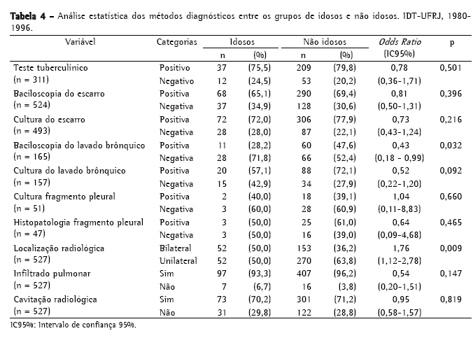A Tabela 4 sintetiza os achados dos principais métodos diagnósticos de TP. A freqüência de positividade dos métodos diagnósticos foi elevada nos dois grupos. Apenas 12 pacientes idosos (10,3%) e 34 pacientes não idosos (7,3%) preencheram diagnóstico por probabilidade. Os demais obtiveram confirmação bacteriológica. O único método bacteriológico a ter comprovada significância estatística a favor dos não idosos foi a baciloscopia do lavado brônquico, positiva em 60 (47,6%) não idosos contra 11 (28,2%) idosos (p = 0,032). A baciloscopia do escarro teve positividade semelhante entre os grupos, variando de 65,1% nos idosos a 69,4% nos não idosos. A cultura do escarro, igualmente, apresentou elevada positividade em toda a amostra (acima de 72%), não havendo significância estatística. O teste tuberculínico também mostrou igual reatividade entre os grupos (acima de 75%), enquanto as alterações radiológicas do tórax mais encontradas foram infiltrados (acima de 90%) e cavitações (acima de 70%). O radiograma torácico, porém, não revelou predominância de nenhum destes achados nos grupos estudados (Tabela 4). A extensão da doença, entretanto, avaliada pela uni ou bilateralidade das lesões, apresentou diferença estatisticamente relevante nos idosos, com 50% de relatos de lesões bilaterais, contra 36% de não idosos (p = 0,009). O estudo histopatológico pleural, pouco usado nesta população de pacientes, teve desempenho regular nos dois grupos, com positividade de 50% nos idosos e 61% nos não idosos.