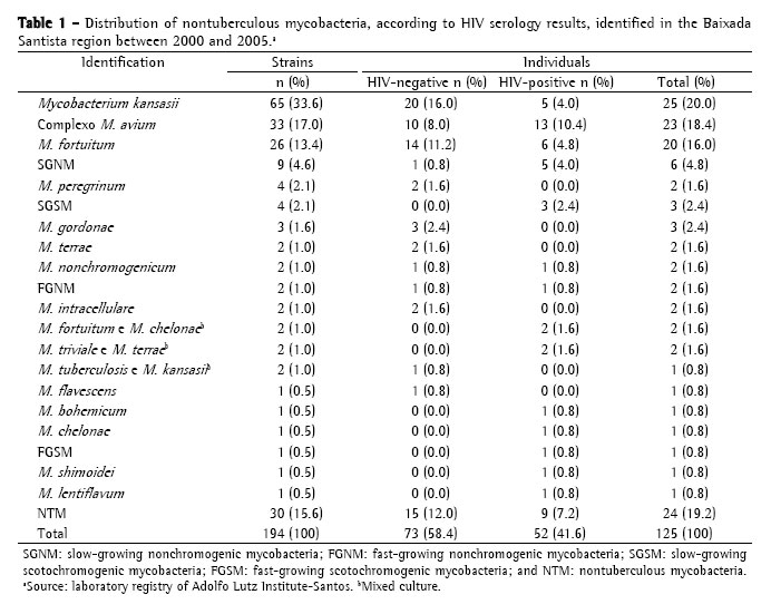 Objective: The present study aims at describing the frequency of nontuberculous mycobacteria (NTM) species identified through laboratory testing of samples collected from non-sterile sites (sputum), as well as its frequency in HIV-infected and non-HIV-infected individuals in the Baixada Santista region of the state of São Paulo, Brazil, in the period from 2000 to 2005. Methods: Retrospective analysis of sputum smear microscopy results and culture was conducted based on the records on file at the Instituto Adolfo Lutz-Santos, the regional tuberculosis laboratory. Results: We analyzed 194 NTM strains isolated from 125 individuals, of whom 73 (58.4%) were HIV-negative and 52 (41.6%) were HIV-positive. Thirteen different species were identified: Mycobacterium kansasii; M. avium complex; M. fortuitum; M. peregrinum; M. gordonae; M. terrae; M. nonchromogenicum; M. intracellulare; M. flavescens; M. bohemicum; M. chelonae; M. shimoidei; and M. lentiflavum. In 19.2% of the cases, the bacteriological diagnosis was confirmed by isolation of the same species in at least two consecutive samples. Conclusions: Our results show the importance of including systematic identification of NTM in the laboratory routine, and that its integration into the clinical routine could improve the characterization of the disease, thereby informing the planning of effective control measures in specific populations, such as individuals presenting tuberculosis/HIV co-infection.