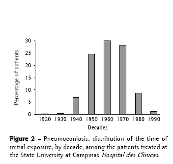 As shown in Figure 1, most cases were diagnosed in the 1980s and 1990s, with a tendency toward decline in the following decade. The duration of exposure was less than 5 years in 55 cases (4.8%), from 5 to 9 years in 170 cases (14.8%) and greater than 9 years in 780 cases (68%). In most cases, the duration of exposure was between 10 and 24 years, although only 6.5% of the patients had been exposed for more than 30 years. These data are in contrast with those obtained in the American states of Michigan, New Jersey and Ohio,(4) where only 7% of patients with pneumoconiosis had been exposed for less than 10 years, whereas 32.3% had been exposed for more than 30 years (Table 1). In Figure 2, we observe that the initiation of exposure, in Brazil, was concentrated in the 1950s, 1960s and 1970s, with a pronounced decline beginning in the 1980s.