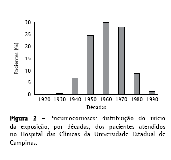 Conforme observado na Figura 1, a maioria dos casos foram diagnosticados nas décadas de 1980 e 1990, com tendência à redução na década seguinte. Em relação à distribuição dos tempos de exposição, encontramos 55 casos (4,8%) com tempo menor de 5 anos, 170 (14,8%) entre 5 e 9 anos de exposição e 780 casos (68%) com tempo superior a 9 anos. Desta forma, a maioria dos pacientes com pneumoconiose tiveram um tempo de exposição entre 10 e 24 anos, com apenas 6,5% apresentando valores maiores do que 30 anos. Tais dados contrastam com os observados nos estados de Michigan, Nova Jersey e Ohio, nos Estados Unidos,(4) onde apenas 7% tinham tempo de exposição menor do que 10 anos, enquanto 32,3% foram expostos por mais de 30 anos (Tabela 1). Na Figura 2, observa-se que o início da exposição, no nosso meio, concentrou-se nas décadas de 1950 a 1970, com redução pronunciada a partir dos anos 80.