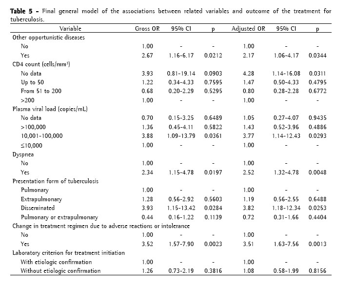 For each of the groups, all variables presenting associations that were independent of the outcome were introduced into the final multivariate model. The following variables remained in the final model: other concomitant opportunistic diseases; CD4 count; plasma viral load; dyspnea; the disseminated form of TB; and change in the TB treatment regimen due to adverse reactions or intolerance, thus constituting the group and variables with the closest association with the outcome (Table 5).