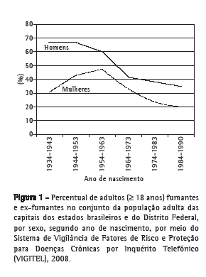 A Figura 1 mostra a prevalência de adultos que iniciaram o tabagismo (fumante atual + ex-fumante) por coorte de nascimentos. Pode-se verificar o declínio da prevalência do tabagismo entre homens nas últimas décadas no país. Os homens atualmente vivos com idade entre 65 e 74 anos, isto é, nascidos entre os anos de 1934 e 1943, apresentavam uma prevalência de tabagismo igual a 67,2%, que caiu entre os nascidos entre 1954 e 1963 (60,3%), passando para 41,5% nos nascidos entre 1964 e 1973 e para 35% nos nascidos nos anos 1984-1990. Para as mulheres, o aumento se dá um pouco mais tarde, passando de 30,7%, entre os anos 1934-1943, para 47,7% nos anos 1954-1963, caindo para 32,6% entre 1964 e 1973 e, posteriormente, para 20,2% entre os anos 1984-1990.