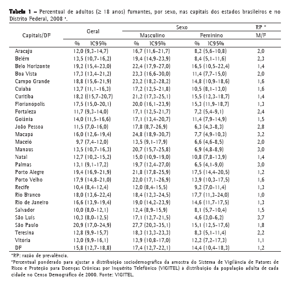 A frequência de adultos que fumam variou entre 9,7%, em Maceió, e 20,9%, em São Paulo. O tabagismo se mostrou mais disseminado entre homens do que entre mulheres em todas as cidades, embora as diferenças segundo o sexo tenham variado muito de cidade para cidade. Por exemplo, em Macapá, o ato de fumar foi cerca de três vezes mais frequente entre homens do que entre mulheres (24,8% e 7,7%, respectivamente) enquanto, em Porto Alegre, não houve diferença significativa entre os sexos (21,8% no masculino e 17,5% no feminino). As maiores frequências de fumantes foram encontradas, entre homens, em São Paulo (27,7%), Macapá (24,8%) e Boa Vista (23,3%) e, entre mulheres, em Rio Branco (17,7%), Porto Alegre (17,5%) e Belo Horizonte (16,5%). As menores frequências de fumantes no sexo masculino ocorreram em Recife (12,0%), Salvador (12,4%) e Maceió (13,5%) e, no sexo feminino, em São Luís (4,6%), João Pessoa (6,3%) e Palmas (6,5%; Tabela 1).