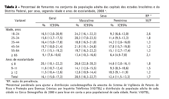 No conjunto da população adulta das 27 cidades estudadas pelo VIGITEL, a frequência de fumantes foi de 16,1%, sendo maior no sexo masculino (20,5%) do que no sexo feminino (12,4%). Entre homens, a frequência de fumantes se mostrou relativamente estável até os 64 anos de idade (cerca de 20%), declinando para 13% na faixa etária de 65 ou mais anos de idade. Entre mulheres, a frequência de fumantes aumentou com a idade ao longo das faixas etárias entre 18 e 54 anos (de 9% para 18%), declinando, respectivamente, para 15,1% e 6,4% nas duas faixas etárias subsequentes. A frequência do ato de fumar foi particularmente alta entre homens e mulheres com até 8 anos de escolaridade (26,6% e 14,6%, respectivamente), excedendo em quase duas vezes a frequência observada entre indivíduos com maior escolaridade no caso dos homens (Tabela 2).