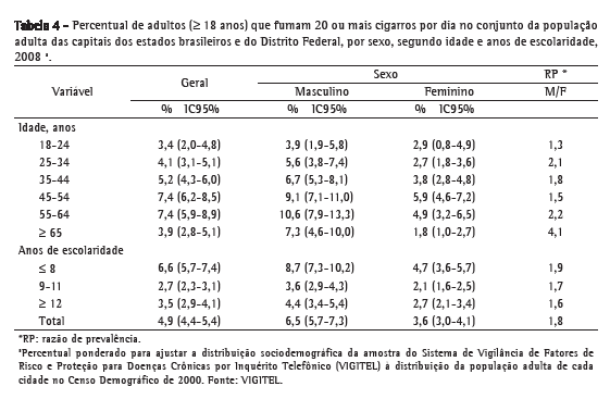 No conjunto da população adulta das 27 cidades, a frequência de adultos que declararam fumar ≥ 20 cigarros/dia foi de 4,9%, sendo maior no sexo masculino (6,5%) do que no sexo feminino (3,6%). Entre homens, a ­frequência do consumo intenso de cigarros tendeu a aumentar com a idade, mais do que duplicando entre as faixas etárias dos 18-24 aos 55-64 anos de idade. A relação com a idade foi menos clara no caso das mulheres, notando-se, entretanto, um declínio a partir dos 65 anos de idade. A frequência do consumo ≥ 20 cigarros/dia foi particularmente alta entre homens e mulheres com até 8 anos de escolaridade (8,7% e 4,7%, respectivamente), excedendo em cerca de duas vezes a frequência observada entre indivíduos com maior escolaridade (Tabela 4).