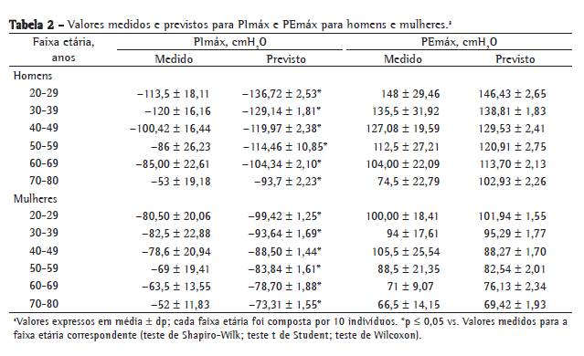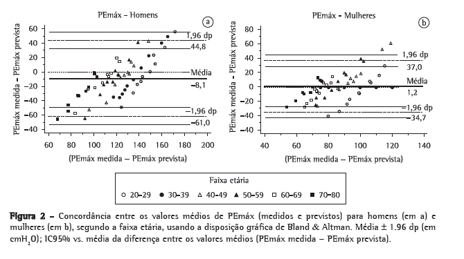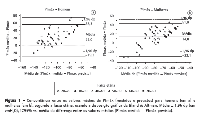Para homens: PImáx: y = −0,80 × idade + 155,3 PEmáx: y = −0,81 × idade + 165,3 Para mulheres: PImáx: y = −0,49 × idade + 110,4 PEmáx: y = −0,61 × idade + 115,6 Os dados foram analisados estatisticamente por meio do programa Statistical Package for the Social Sciences, versão 11.0 (SPSS Inc., Chicago, IL, EUA). Inicialmente, para comparar os valores medidos com aqueles previstos através das equações propostas por Neder et al.,(6) o teste de Shapiro-Wilk foi usado para a avaliação de distribuição normal. O teste t de Student foi usado para variáveis com distribuição normal, ao passo que o teste de Wilcoxon foi usado para as variáveis que não apresentaram distribuição normal. Para a disposição gráfica de Bland & Altman, foi usado o programa Medcalc, versão 9.4.1.0 (MedCalc Software, Mariakerke, Bélgica).