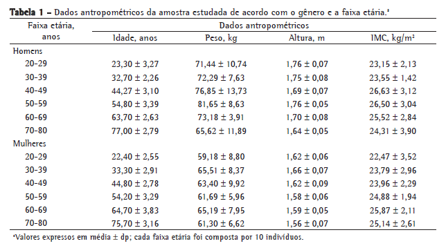 Participaram do estudo 120 indivíduos saudáveis (60 homens e 60 mulheres), com idades entre 20 e 80 anos, residentes em São Carlos (SP). Cada uma das seis faixas etárias de 10 anos usadas no estudo foi composta por 10 homens e 10 mulheres.