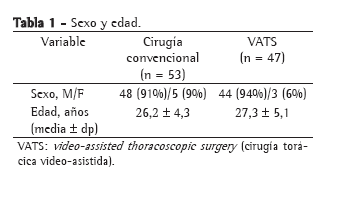 El tiempo operatorio en el grupo toracotomía fue en promedio de 76 ± 15,6 minutos, en contraste con 52 ± 12,4 en el VATS (p = 0.05).