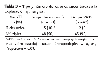 Las dificultades intraoperatorias se presentaron en los pacientes de ambos grupos con mayor número de recurrencia (3 o 4), ocasionadas por la presencia de adherencias pleuropulmonares fibroconjuntivas densas que prolongaron el tiempo operatorio, sin significación estadística. En la Tabla 3 se muestra el número de bullas encontradas.