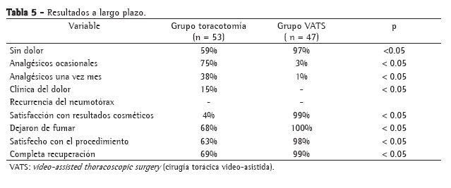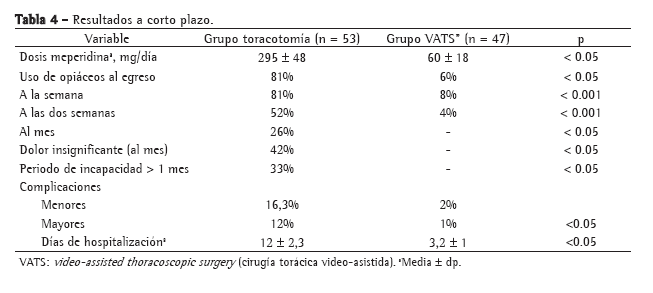 El 81% de los pacientes sometidos a toracotomía y el 6% del grupo VATS requirieron analgesia con opiáceos orales luego de su egreso del hospital (p < 0.05). La Tabla 4 presenta los resultados a corto plazo.