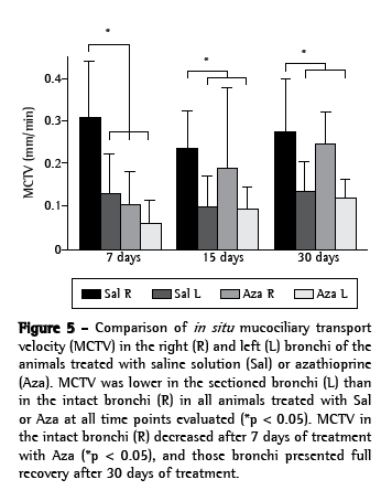 In the animals that received azathioprine, we found that it reduced MCT velocity in the group killed after 7 days of treatment both on the right (intact) side and on the left (operated) side. Over time, there is evident recovery of MCT velocity on the right and left sides, indicating that MCT velocity is affected by azathioprine only in initial period of up to 7 days of treatment. This mechanism might result from the fact that azathioprine decreases cell activity and reaches the ciliated cells, altering their function. The recovery of ciliated cell function, over time, in the group that received azathioprine is probably due to two factors that lead to increased MCT velocity: bronchial scarring and improved mucus formation/properties. Many immunosuppressive protocols include azathi oprine as a pre-operatively administered drug.(19) Based on the results of the present study, we suggest that azathioprine administration, as well as the duration of azathioprine treatment in the post-transplant period, be the object of several other experimental studies.