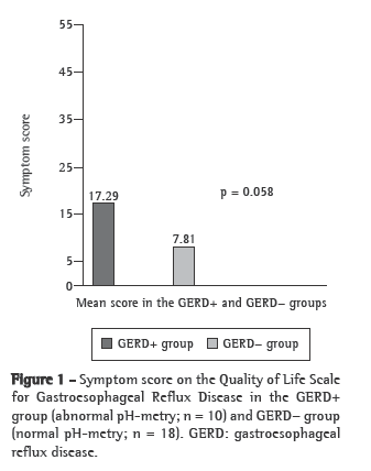 The statistical analysis included the comparison of data related to the patients with GERD (abnormal pH-metry) and those without GERD (normal pH-metry). The chi-square test and the Student's t-test were used. The level of significance was set at 5%.