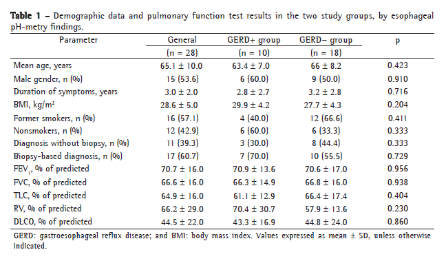 A diagnosis of IPF can be safely established by the finding of a usual interstitial pneumonia pattern in the anatomopathological examination of material obtained through open lung biopsy. However, not all of the case series described present the histological analysis. In the present study, 60.3% of the patients were submitted to open lung biopsy, whereas the remaining patients were definitely diagnosed with IPF based on the ATS/ERS criteria for making a diagnosis of IPF in the absence of open lung biopsy, those criteria having a specificity of up to 96.0%.(3) However, the fact that biopsy was not performed in all cases might have been an unfavorable factor for the analysis of the results as a whole. In most studies of IPF, the clinical manifestations presented by the patients were not sufficient to distinguish patients with pathological GER from those without it, since approximately half of the patients do not report typical symptoms, such as heartburn or regurgitation.(5-7,9,28,29) In the present study, 77.7% of the patients with pathological GER presented at least one typical symptom. Cough, the most common extraesophageal respiratory symptom of GERD,(19) is present in most patients, regardless of the presence of GERD. Within the context of IPF, it is practically impossible to determine whether cough is due to the lung disease or whether it is caused or exacerbated by GER. In addition, cough itself can cause GER, due to increased intra-abdominal pressure, leading to a cough-reflux-cough cycle.(24) Although some GERD− group patients presented GERD symptoms, the impact was small, according the quality of life scale. However, no investigation aimed at clarifying the diagnosis of the causal agent of those symptoms was performed. The differential diagnosis of GERD can include peptic disease, functional dyspepsia, cholelithiasis, ischemic cardiomyopathy and achalasia.(27)