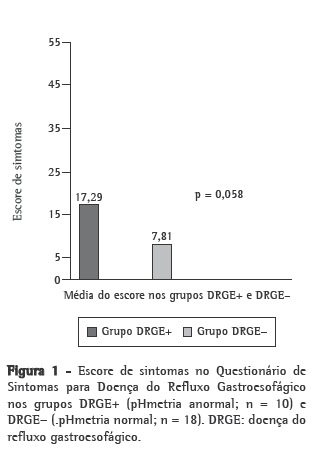 Mesmo com a pHmetria normal, 6 pacientes (33,3%) apresentavam pelo menos um sintoma típico de DRGE. A tosse foi o sintoma mais frequente (15 pacientes; 83,3%). Comparando-se as características demográficas, espirométricas e os resultados do questionário de sintomas, não houve diferenças significativas entre os grupos, exceto pela dor torácica, mais frequente nos pacientes do grupo DRGE+ (Tabelas 1 e 2). A média do escore do QSDRGE foi, respectivamente 17,2 e 7,8 nos grupos DRGE+ e DRGE−, sendo essa diferença marginal (p = 0,058, Figura 1).