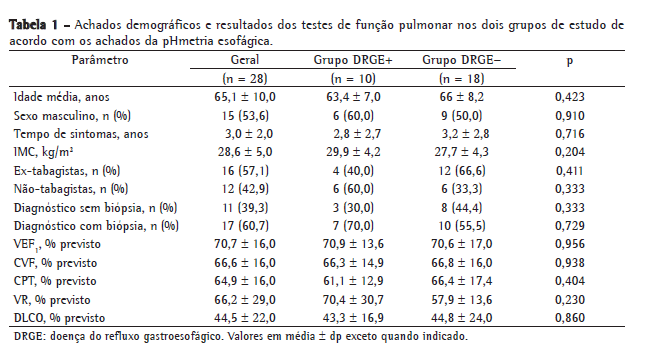 Dos 28 pacientes adultos incluídos no estudo, com idades entre 49 e 80 anos (média de 64,3 anos), 15 (53,6%) eram homens, e 13 (46,4%) eram mulheres. A média do tempo de sintomas atribuídos à FPI foi de 3,2 anos, sendo a dispneia de esforço e a tosse os sintomas mais frequentes. O IMC médio do grupo todo foi de 28,6 kg/m2. A maioria dos pacientes era de tabagistas ou ex-tabagistas (57,1%). A pHmetria esofágica de 24 h detectou a presença de refluxo ácido anormal em 10 pacientes (35,7%). As características clínicas dos 28 pacientes estudados encontram-se na Tabela 1. Os pacientes foram divididos em dois grupos, conforme os resultados da pHmetria esofágica: grupo com refluxo ácido patológico (DRGE+; n = 10), e grupo com pHmetria normal (DRGE−; n = 18).