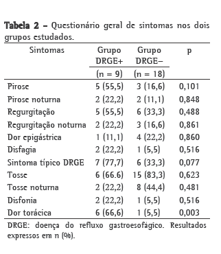 Na pHmetria esofágica de 24 h, 80,0% dos pacientes do grupo DRGE+ apresentavam refluxo em posição supina, sendo que, em 30,0% desses, o refluxo era exclusivamente nessa posição. Houve diferenças significativas entre os grupos DRGE+ e DRGE− quanto ao percentual de tempo em posição ortostática com pH < 4, ao número de episódios de RGE e ao número de episódios com duração acima de 5 min. Os achados da pHmetria esofágica estão descritos na Tabela 3.