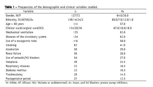 The frequencies of the demographic and clinical variables studied are shown in Table 1. Among the 199 cases studied, the mean age was 59 ± 19 years; the mean length of hospital stay was 15 ± 22 days; the mean length of use of a nasogastric feeding tube was 7 ± 13 days; the mean length of stay on mechanical ventilation was 6 ± 12 days.
