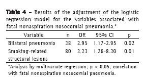 Smoking-related structural lesions impair the local defenses of the lung and increase the chances of colonization by Pseudomonas ­aeruginosa and other gram-negative bacilli,(18,19) thereby increasing the risk of pneumonia with an unfavorable prognosis for individuals with smoking-related sequelae.(16,17) In the present study, clinical data related to smoking or respiratory diseases were not found to be associated with the fatal outcomes studied. However, we must underscore that not every smoker develops structural lesions in the respiratory system, since this process also depends on genetic influences of the individual,(18) and that smoking-related structural lesions are not limited to COPD and interstitial lung disease. Another strong bias that might have influenced our findings is the possibility that cases of chronic bronchitis/emphysema and other chronic respiratory diseases had not been clinically diagnosed and were only identified during the autopsy. Therefore, only the cases that presented smoking-related structural lesions at autopsy were at increased risk for developing fatal NP, a finding that corroborates the results obtained by another group of authors,(20) who investigated the association between pulmonary structural diseases and the increase in morbidity and mortality in nosocomial bronchopulmonary infections.