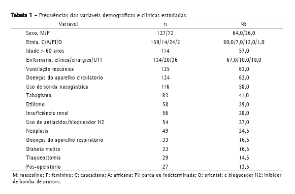 As frequências das variáveis demográficas e clínicas estudadas estão expressas na Tabela 1. Na casuística de 199 casos, a idade média dos pacientes foi de 59 ± 19 anos, o número médio de dias de internação foi de 15 ± 22 dias, o tempo médio de uso de sonda nasoenteral foi de 7 ± 13 dias, e o tempo médio em ventilação mecânica foi de 6 ± 12 dias.