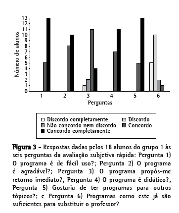 A forma de avaliação subjetiva rápida realizada logo após o estudo por computador mostrou uma grande maioria de respostas satisfatórias para as perguntas sobre o fácil uso do programa, se é agradável, se propôs retorno imediato, se é didático, e se os alunos gostariam de ter programas para outros tópicos. A essas questões, acrescentamos uma que julgamos provocativa. Queríamos questionar esta geração de alunos a respeito da viabilidade da substituição do professor pelo programa de computador. Certamente, este não é o debate principal deste trabalho.
