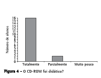 Totalmente didático, 16 alunos (88,9%); parcialmente didático, 2 alunos (11,1%); muito pouco, 0 alunos (0%). As freqüências das respostas dos alunos estão apresentadas na Figura 4.