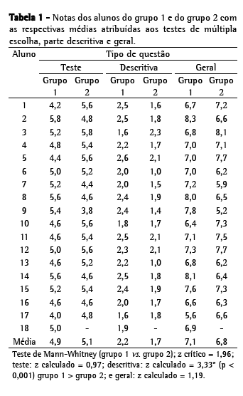 Quando se compararam as notas das questões descritivas do grupo 1 e do grupo 2, encontrou-se um z calculado de 3,33 para um z crítico de 1,96, havendo, portanto, diferença significante para p < 0,001, isto é, as notas das questões descritivas do grupo 1 foram significantemente maiores que as do grupo 2.