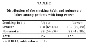 DISCUSSIONIn the literature, there have been only a few studies associating the location of lung tumors with the smoking habit and gender. These studies mention tumor preference for the upper lobe but, despite the fact that the majority of the patients studied were smokers, do not clearly associate it with the smoking habit, giving more weight to correlations with asbestos exposure and diet.(6-7,10)