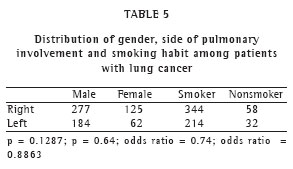 METHODSWe evaluated 697 patients presenting lung tumors, all of which were submitted to chest X-rays and computed tomography scans of the chest. The diagnoses were confirmed through anatomopathological examination of material obtained from bronchoscopy or open lung biopsy. These patients were admitted to the Pulmonology-Oncology Outpatient Clinic of the University of São Paulo, between 1986 and 2004. The tumor sites were evaluated through imaging, and were classified as follows: right and left sides; upper and lower lobes; in smokers and in nonsmokers; in males and in females. Upper lobe tumor sites were defined as those located in the upper or middle lobes of the right lung or in the upper lobe of the left lung, whereas those located in the lower lobes were considered lower lobe tumor sites. Patients in which tumors were seen on both sides (right and left) or in both lobes (upper and lower) were excluded from the analysis, since it was not possible to determine the initial site of the tumor. In relation to the sides, 49 patients were excluded (40 males and 9 females), and in relation to the lobes, 168 patients were excluded (117 males and 51 females).