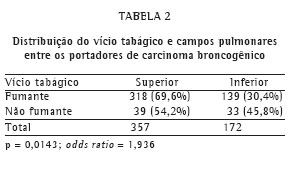 A distribuição da massa tumoral pulmonar conforme o vício tabágico é demonstrada na Tabela 2.
