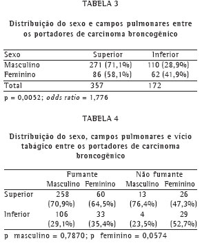 As massas pulmonares ocorreram principalmente no campo pulmonar superior entre os fumantes. Esta diferença foi significativa (p = 0,0143) em relação aos não fumantes. A relação entre os campos superior e inferior entre os fumantes foi de 2,29 e entre os não fumantes de 1,18. As massas no campo pulmonar superior ocorreram predominantemente no sexo masculino. A relação entre os campos superior e inferior entre os sexos masculino e feminino foi, respectivamente, de 2,46 e de 1,77 (Tabela 3). Esta diferença foi muito significativa (p = 0,0052).